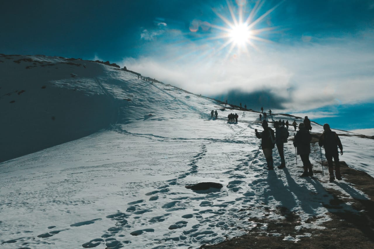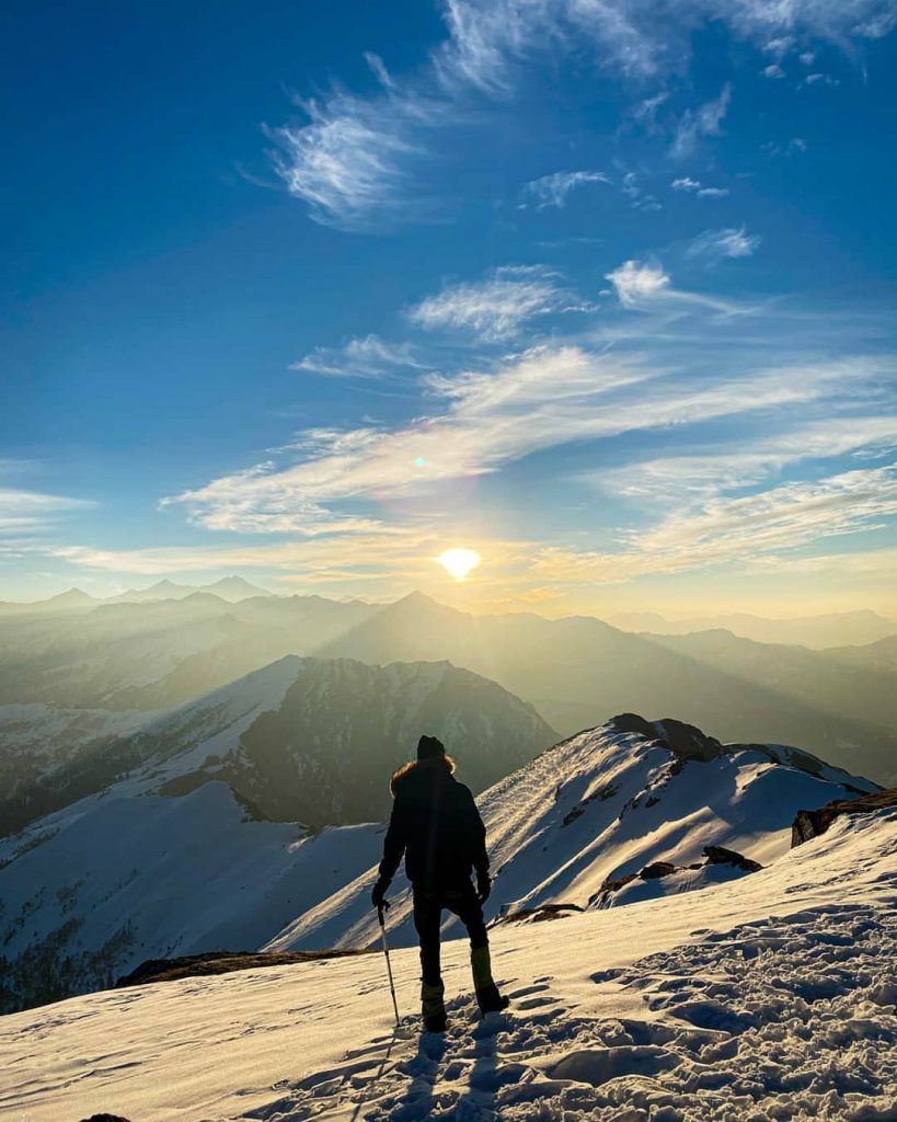At the top, dawn breaks across a 360° panorama of Himalayan giants — peaks like Swargarohini, Bandarpoonch, and Kalanag rise in the distance, their forms carved in ice and light. That moment, standing above the world in the cold clarity of winter, is what carries many trekkers through the frost and the effort.